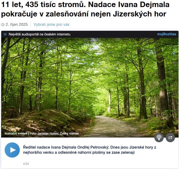 Text je převzat z webu Českého rozhlasu Liberec, kde si ho můžete poslechnout: https://liberec.rozhlas.cz/11-let-435-tisic-stromu-nadace-ivana-dejmala-pokracuje-v-zalesnovani-nejen-9566259